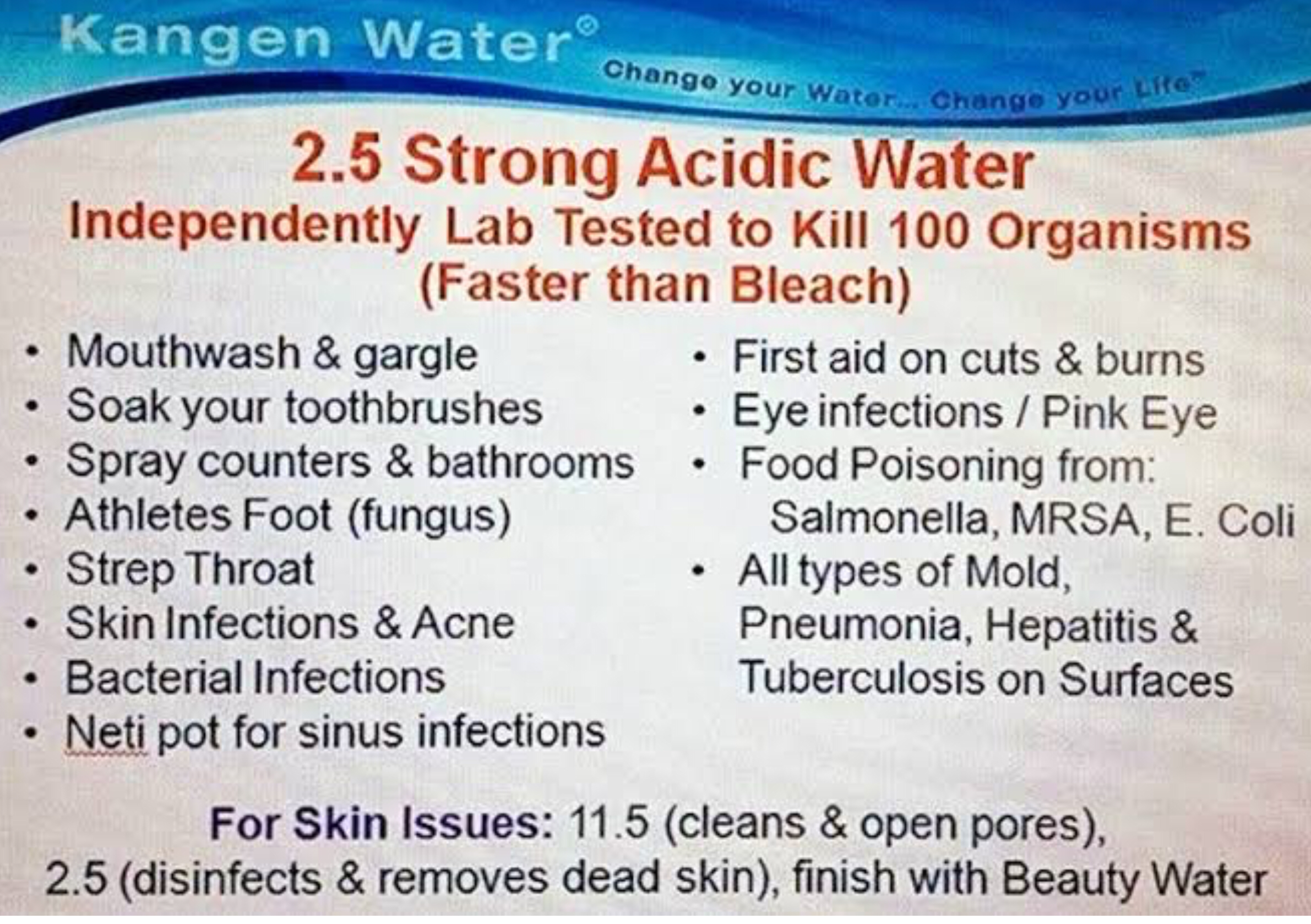 This water has disinfecting properties. Use Strong Acidic Water to sanitise kitchen utensils and countertops to keep areas safe and clean Strong Acidic Water is also a safe hand sanitiser, and can be used for commercial sanitising needs.